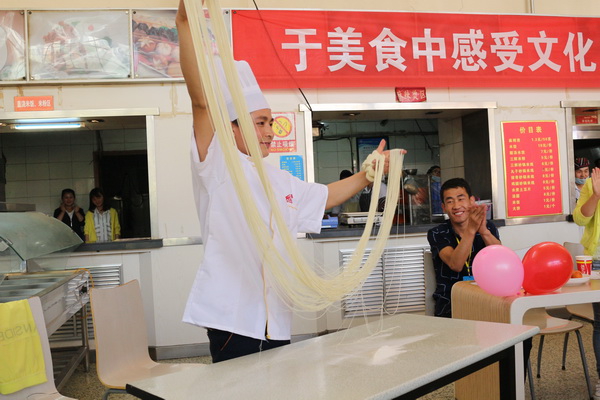 本活动由社会管理公司老员工法律援助中心主办,顶牛拉面协办,共设才艺展示、厨艺大比拼、颁奖等三个环节。社会管理公司何国萍、杨芳老师,顶牛拉面曾银锁、张志强,老员工法律援助中心赵志龙同学和现场的一名同学组成了评委团。来自社会管理公司的六名参赛选手现场烹煮了新疆大盘鸡、牛肉炒饭、红烧鱼、酸辣土豆丝等拿手好菜,选手们娴熟的厨艺和精致的特色美食,赢得了现场师生的阵阵喝彩,特别是顶牛拉面曾银锁师傅表演的“拉面穿针”绝活,让师生赞口不绝。最终,藏族同学卓马吉统制作的牛肉炒饭夺得冠军。