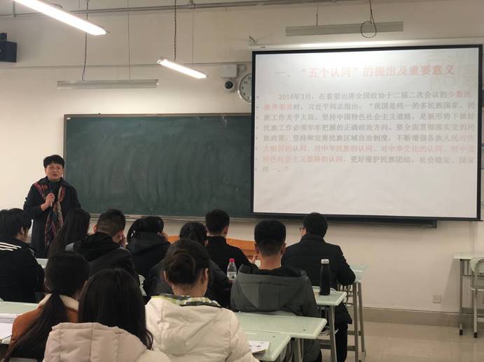 费老师从三个方面进行了讲解,首先就“五个认同”的提出及重要意义进行了阐述。“五个认同”是习近平同志于2015年8月召开的中央第六次西藏工作座谈会上,对2014年以来的思想进行了发展的基础上提出的,“五个认同”即各族群众对伟大祖国、中华民族、中华文化、中国共产党、中国特色社会主义的认同。“五个认同”的意义在于它是维护民族团结的思想之本,是民族团结的前提和根基。接着费老师就“五个认同”的科学内涵进行了深入的讲解。她从历史的角度详细考证了自公元前60年西汉中央政权在新疆设立西域都护府开始,新疆已正式成为中国领土的一部分。后经历朝历代的封建王朝对新疆实行行政管辖,形成了比较成熟的管理体系。费老师着重为同学们讲述了新中国成立后,中国共产党从新疆人民的利益出发,在毛泽东、邓小平、江泽民、胡景涛和习近平几代领导人的领导下,对新疆的治理取得的巨大成就、解放70年来新疆各方面实现的巨大进步、发生的翻天覆地的变化。同学们对新疆的过去和现在了解得更深入,对建国以来中国共产党在新疆发展方面付出的巨大努力由衷地感叹。最后,费老师阐述了增强“五个认同”基本理念的具体举措,即以民生发展增强各族人民的获得感;以各民族交往交流交融凝聚人心;以民族团结教育增强思想共识;以政策创新增强“五个认同”;坚持依法维护民族团结和国家统一。