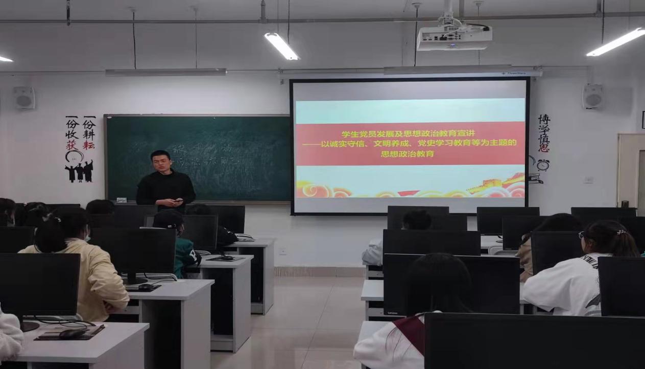 首先,刘绪平老师向同学们讲解了发展党员的条件和流程。随后刘绪平老师以诚实守信、文明养成、党史学习教育等为主题对同学们进行思想政治教育与政治宣讲,为同学们答疑解惑,进行思想教育,引导同学们以积极向上的态度面对接下来的学习和生活。