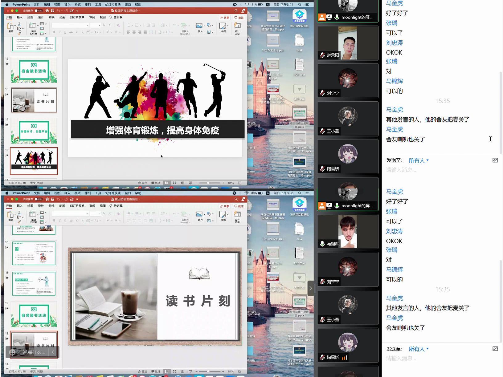 班会第二项开展宿舍读书会活动由学习委员马锦辉发言,马锦辉同学提出在宿舍开展线上读书会,旨在提高同学们的学习积极性和主动性。班主任要求在宿舍正常开展晚自习活动,每天晚上开展线上半小时读书分享会,以马恩经典原著篇目为主,各宿舍均派代表进行读书心得分享,由舍长督促并完成。