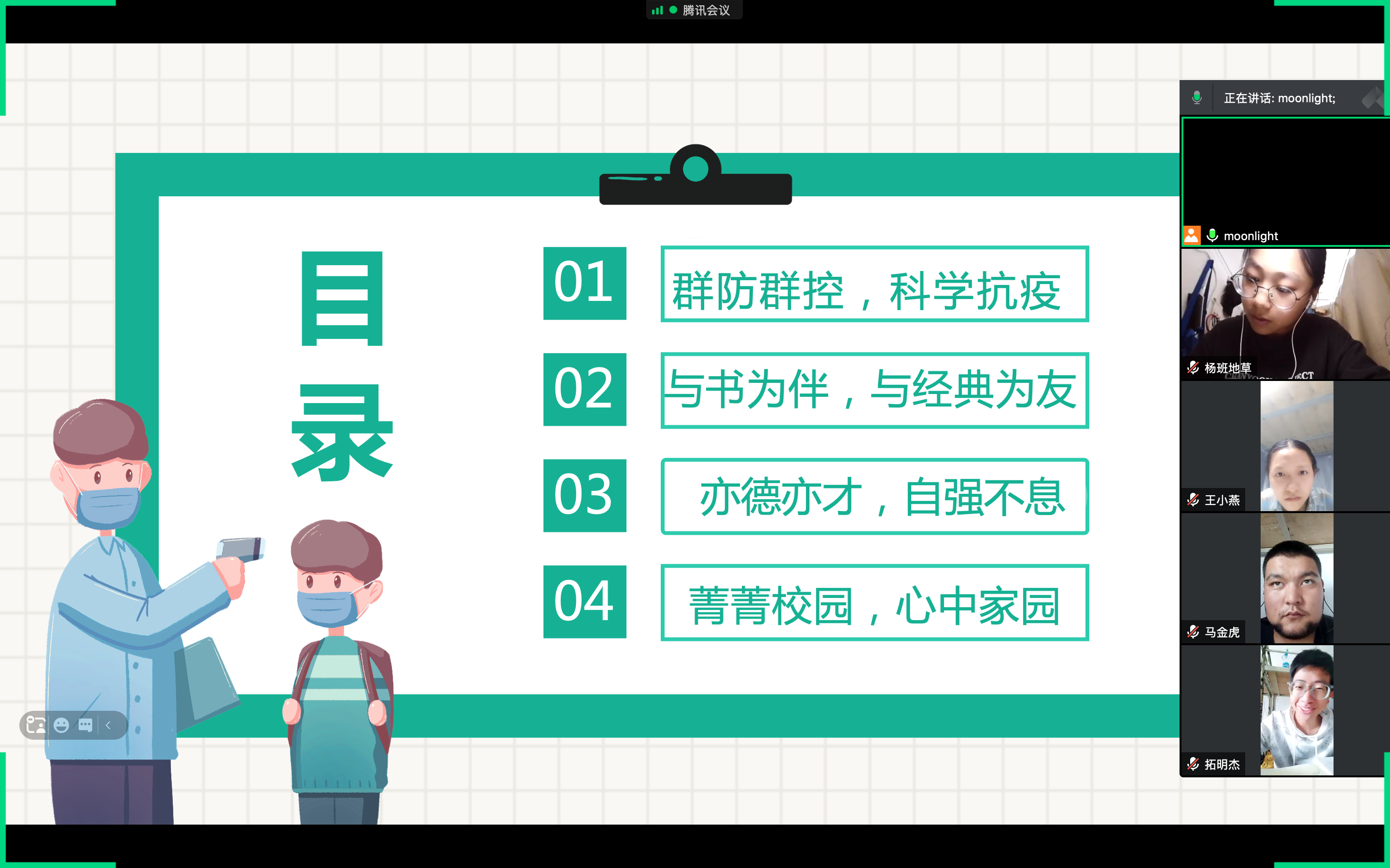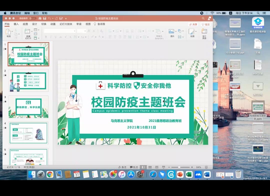 按照甘肃省政府、教育厅对做好新型冠状病毒感染的肺炎疫情防控工作的部署和要求,公司领导高度重视,公司第一时间开展校园防疫工作,宣传提高各位同学对于疫情时期的自我防护,以及了解员工线上学习与宿舍生活的实际情况,21级思想政治教育班决定于2021年10月31日下午15:00点召开《校园防疫》主题班会视频会议,本次班会由班主任任玥老师主持,21级思想政治教育班所有同学参与。