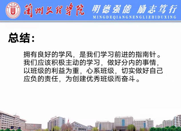最后,马金虎对此次班会做出了总结:拥有良好的学风,是我们学习前进的指南针。我们应该积极主动的学习,做好分内的事情,以班级的利益为重,心系班级,切实做好自己应负的责任,为创建优秀班级而奋斗。此次“学风建设”主题班会,使同学们的学习热情与思想觉悟有了进一步的提高,同时也更加确立了自己的人生规划,明确了自身未来发展方向,起到了加强班级学风建设和创建和谐校园的良好效果,营造了一个积极向上的良好学习氛围。