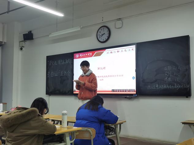李嘉鑫同学对本班2021年后半年团学活动做出详细汇报,本学期共举行了8次团日活动。由于受疫情影响,其中有六次团日活动是在线上举行,两次线下举行。通过这些团日活动,同学们全面贯彻党的先进精神,深入学习党的指导思想,全面落实习近平总书记重要讲话精神以及党中央的工作会议精神。及时向同学们传达党和国家重要会议精神,做到关注时事,了解国内政治,努力做祖国需要的当代老员工,加强习近平总书记重要讲话精神的宣传,引导青年更加自觉地以习近平新时代中国特色社会主义思想武装头脑,进一步增强“四个意识”、坚定“四个自信”、做到“两个维护”,坚定不移跟党走中国特色社会主义道路,为全面建设社会主义现代化国家、实现中华民族伟大复兴中国梦贡献青春力量。