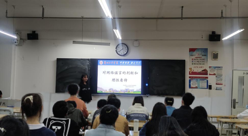 首先,宣传委员王小燕同学强调了在信息沟通交流迅猛发展的今天,网络谣言也频频出现,我们应该自觉地去提高自己对信息分析辨别的能力。之后,王小燕带领大家了解了“行走的50万”和“1450”的概念以及相关案例,这些案例清晰的展现了网络上的一些极端的情绪与虚假的信息给群众和社会带来的危害。最后,王小燕邀请同学们就自己如何在网络中发表言论与转发信息建言献策,同学们积极进行了互动交流。
