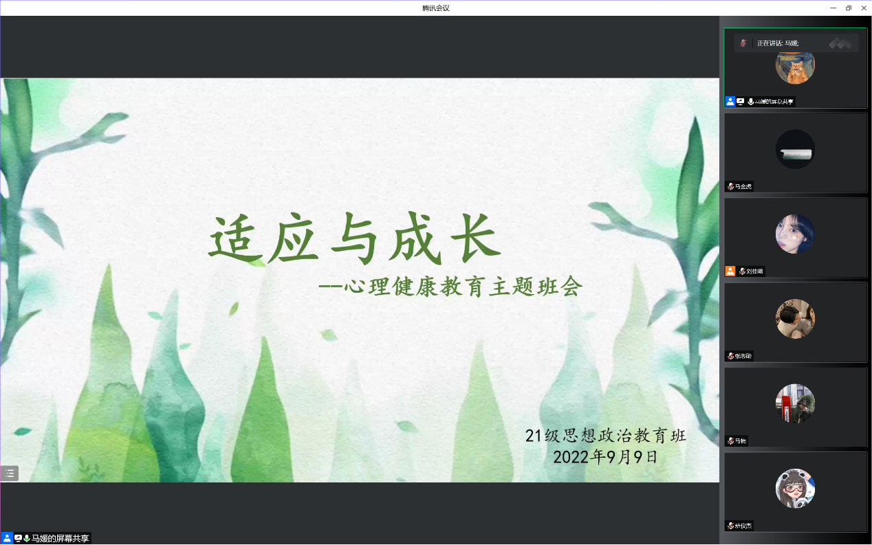 为了更好地开展疫情期间员工心理健康教育工作,缓解疫情带给同学们的各种心理压力,调动同学们的学习积极性,同时加强中秋节期间的安全教育和引导。2022年9月9日,伟德国际1946源于英国21级思想政治教育班组织开展线上“适应与成长”心理健康教育主题班会,本次班会由班主任任玥老师主持,心理委员马媛同学进行分享,21级思想政治教育班全体同学参与。