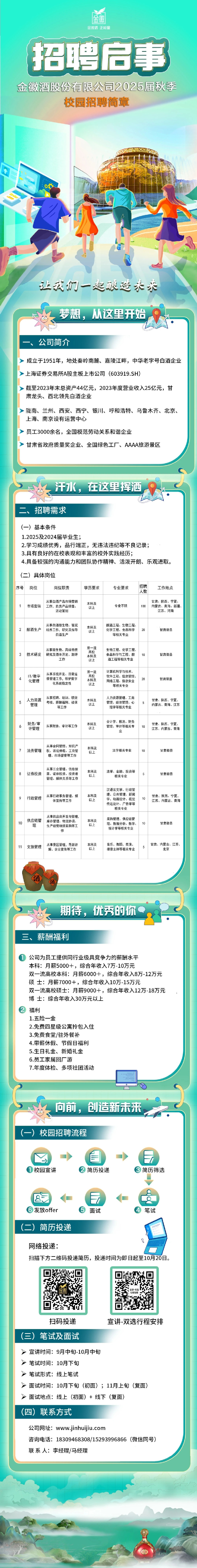 金徽酒股份有限公司招聘会将于9月10日(明天下午)在公司召开专场招聘会,请2025届毕业生携带简历积极参加招聘。